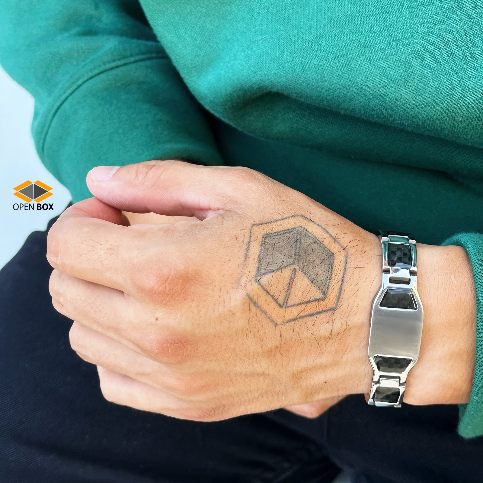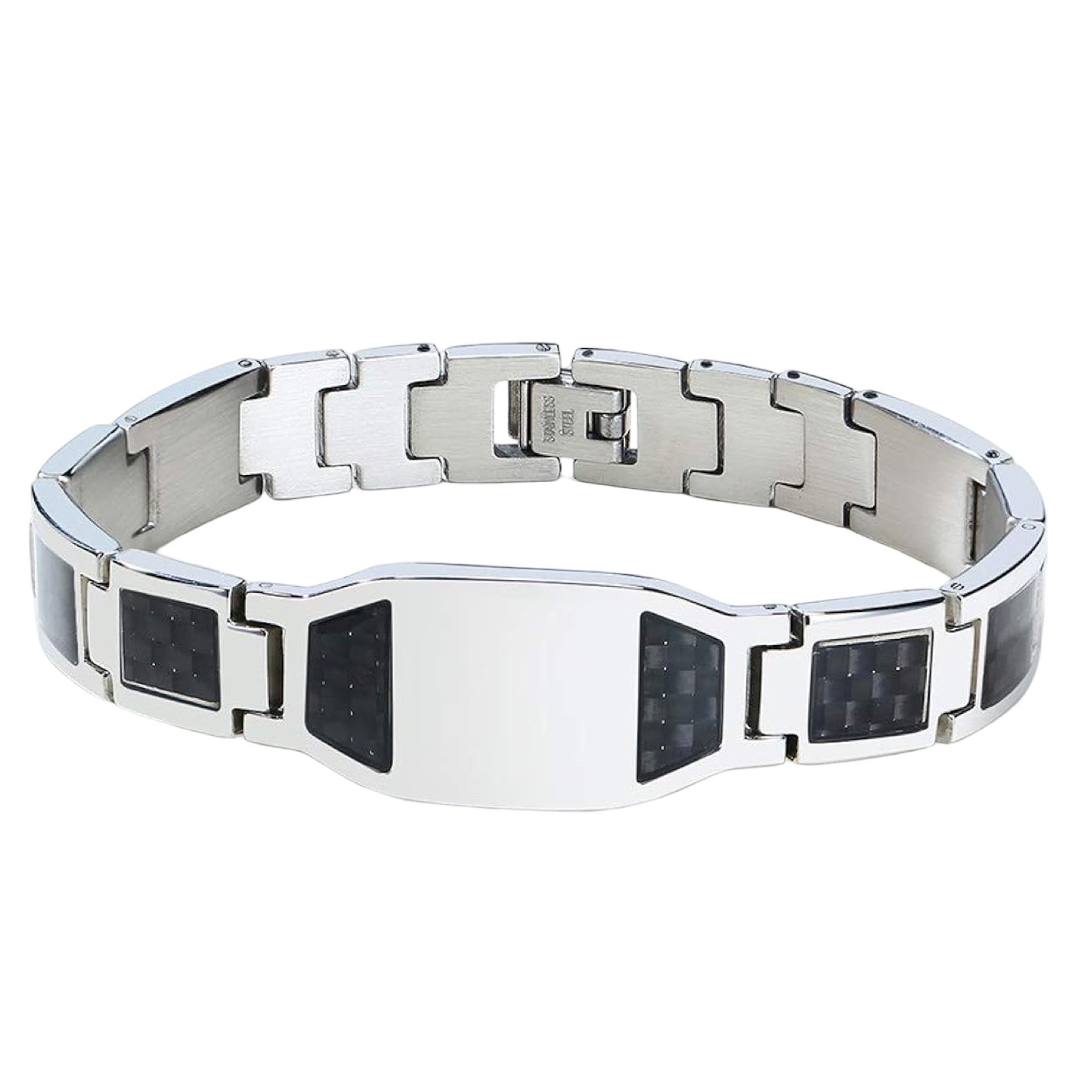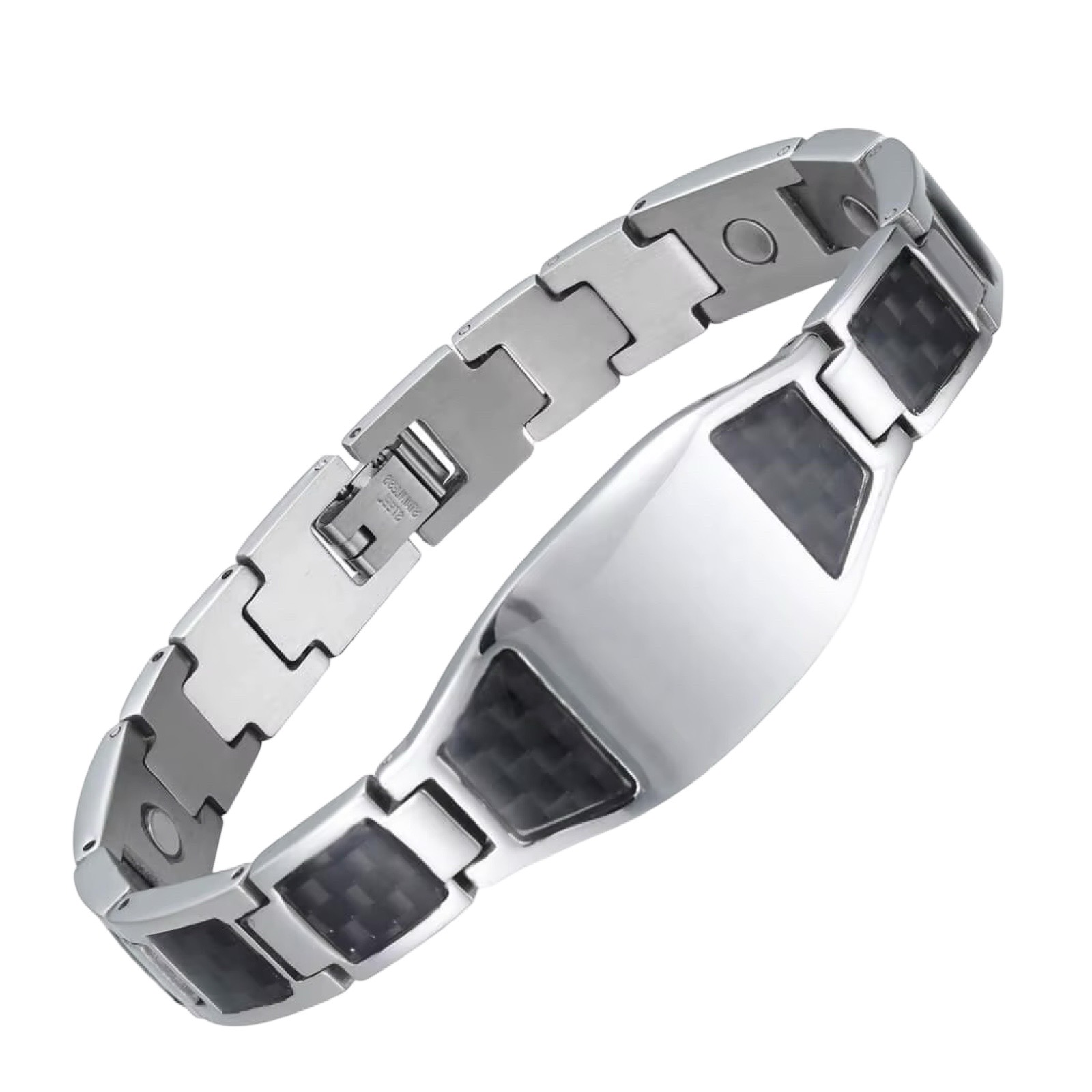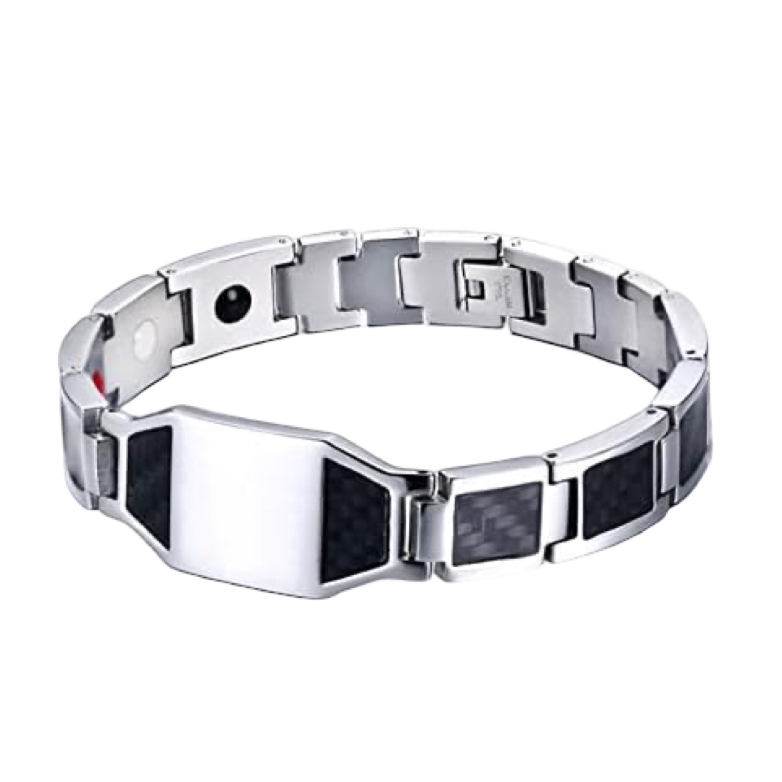 Pulsera de Magnoterapia en acero inoxidable tono plateado con detalles en carbono color negro