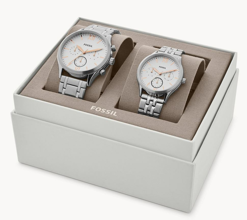 Set de Pareja Fossil Fenmore de acero inoxidable multifunción de tamaño mediano para él y ella BQ2468