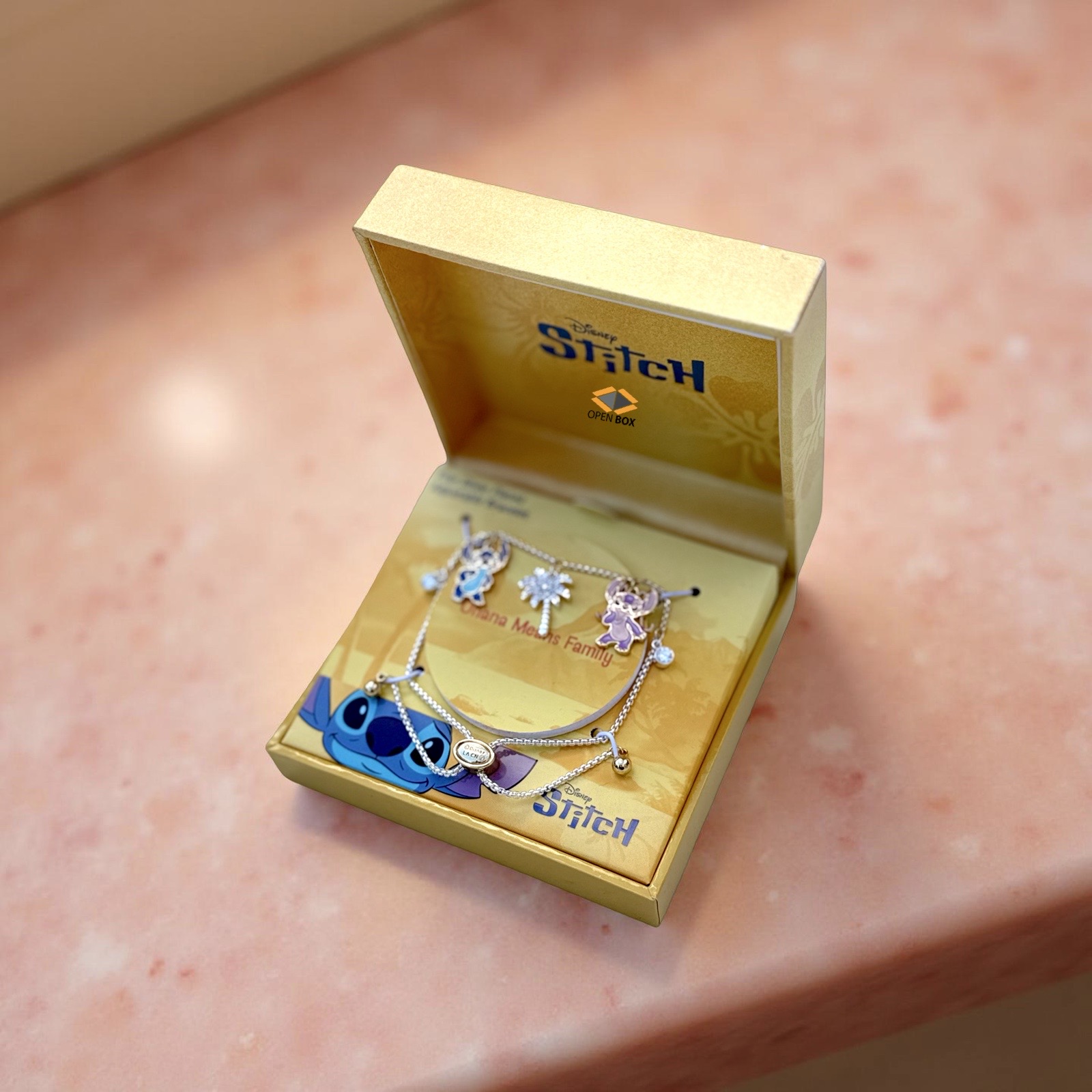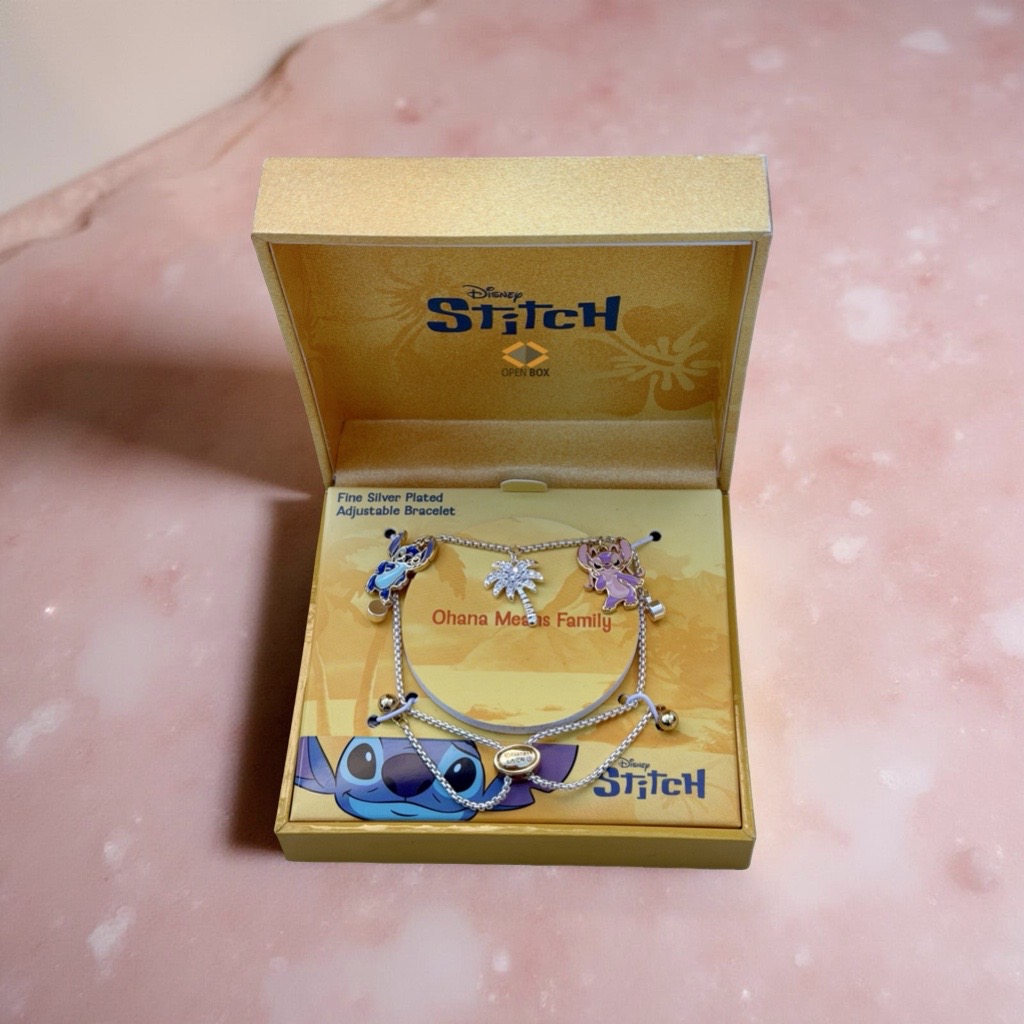 Stitch Pulsera “Ohana means family” ajustable tono plateado con dijes